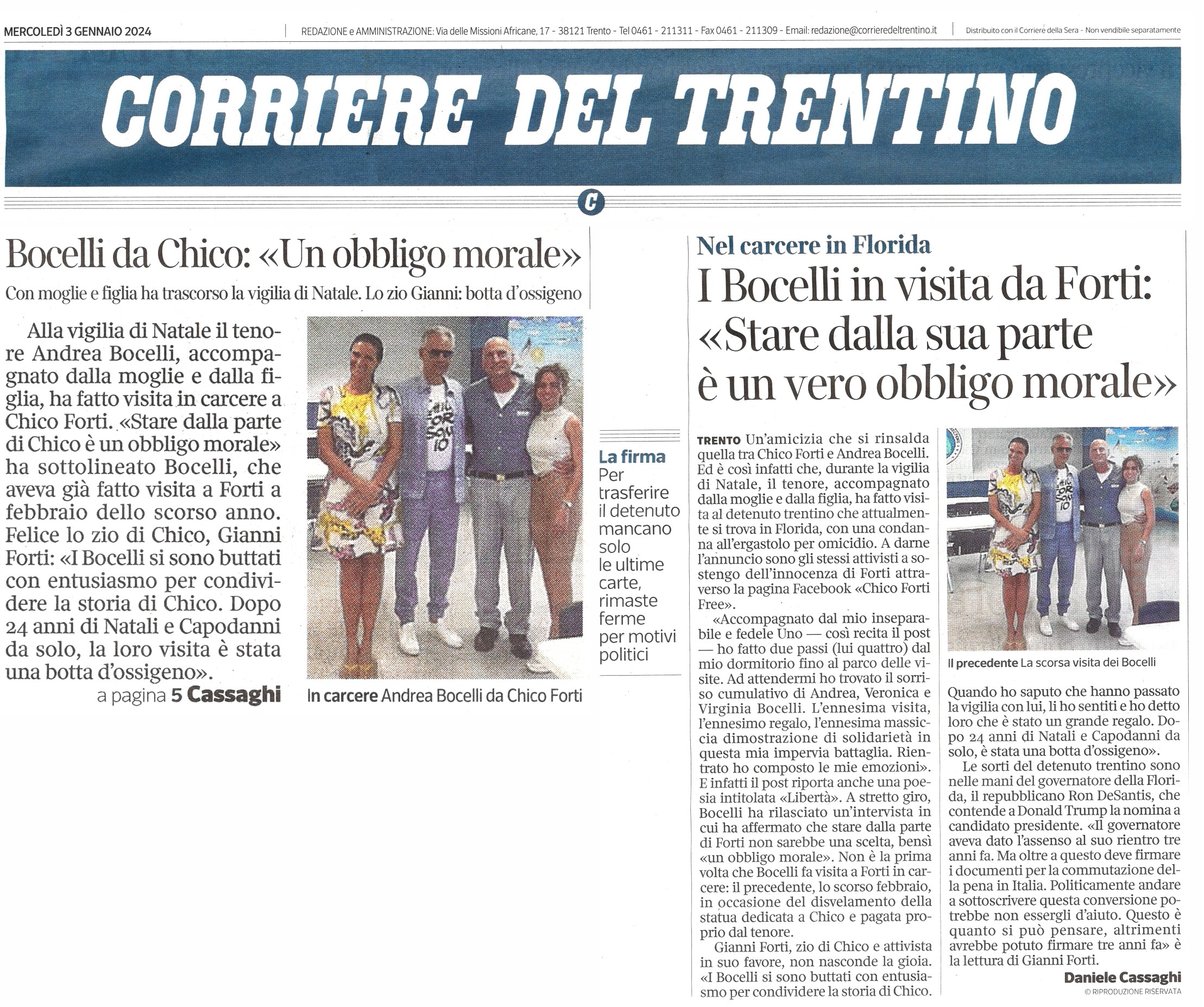 CORRIERE DEL TRENTINO – I Bocelli in visita da Forti: “Stare dalla sua parte è un vero obbligo morale”